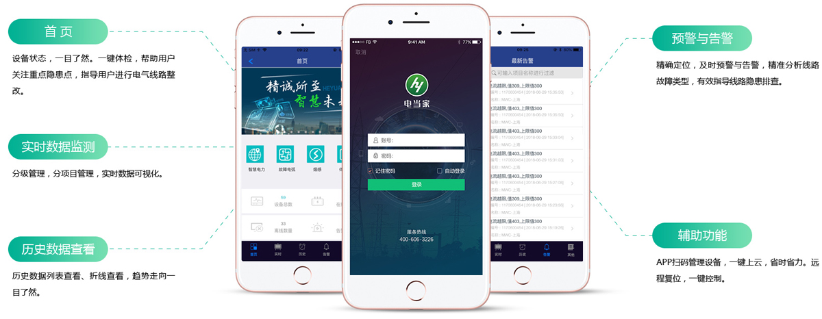 APP服務(wù)端實現(xiàn)運行線路的實時在線監(jiān)測和統(tǒng)計分析,對過流、過壓、剩余電流越限、溫升異常等電氣安全隱患及時報警,并利用短信、電話等多種方式提醒相關(guān)管理人員,提醒和督促用戶及時排查,幫助用戶進行電氣線路整改,有效的消除電氣火災(zāi)隱患。